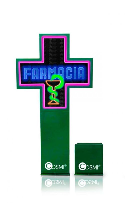 Cruz de farmacia P8S Full Color de alto brillo y bajo consumo, integrada en un solido chasis de metal dos pantallas con acceso en forma de libro.